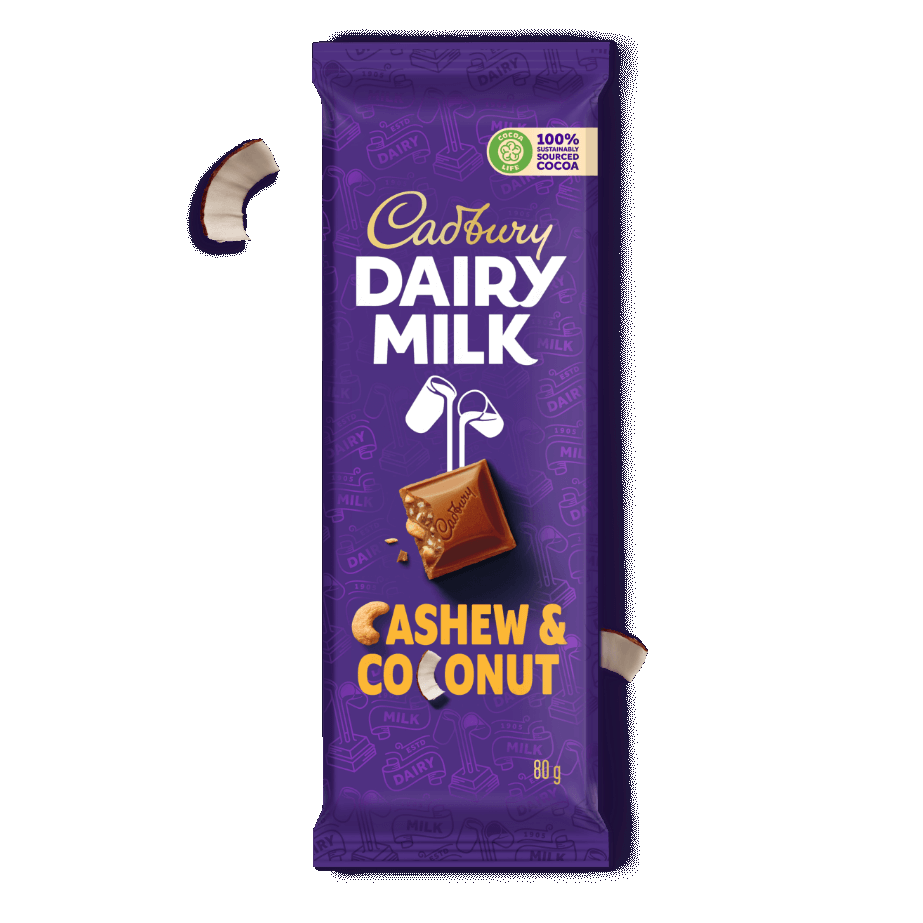 Experience a bite of paradise with Cadbury Dairy Milk Cashew & Coconut 80g — where creamy milk chocolate meets the irresistible crunch of roasted cashews and the delicate sweetness of shredded coconut.